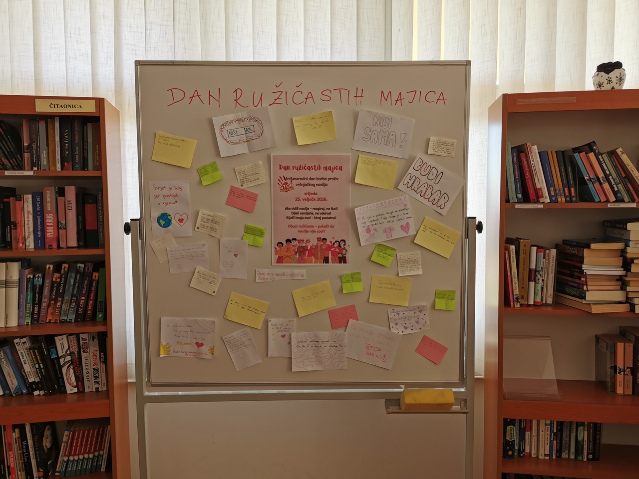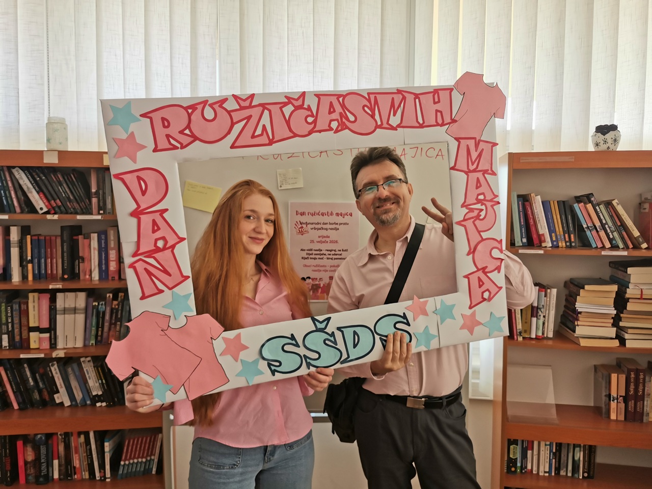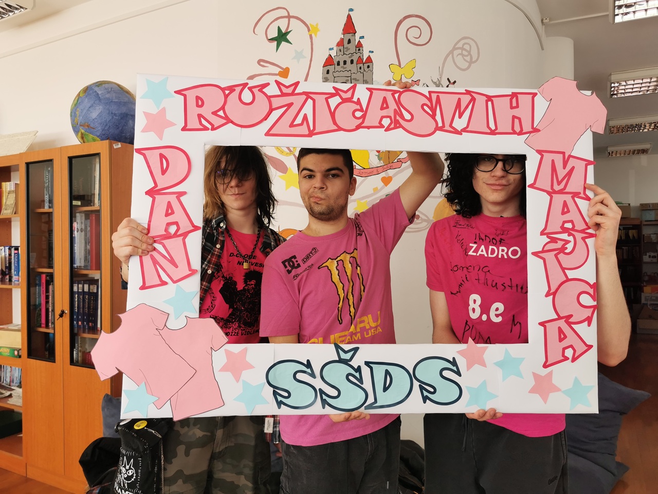 Izrađen je i fotookvir „Dan ružičastih majica“ uz koji su se učenici i djelatnici mogli fotografirati, a poruke učenika izložene su na plakatima kao vidljivi podsjetnik na snagu riječi podrške. Fotookvir i plakate s pristiglim porukama izradile su nastavnica M. Grgurić, školska knjižničarka N. Ćorković, pedagoginja I. Hodak te učenice 2. razreda opće gimnazije.